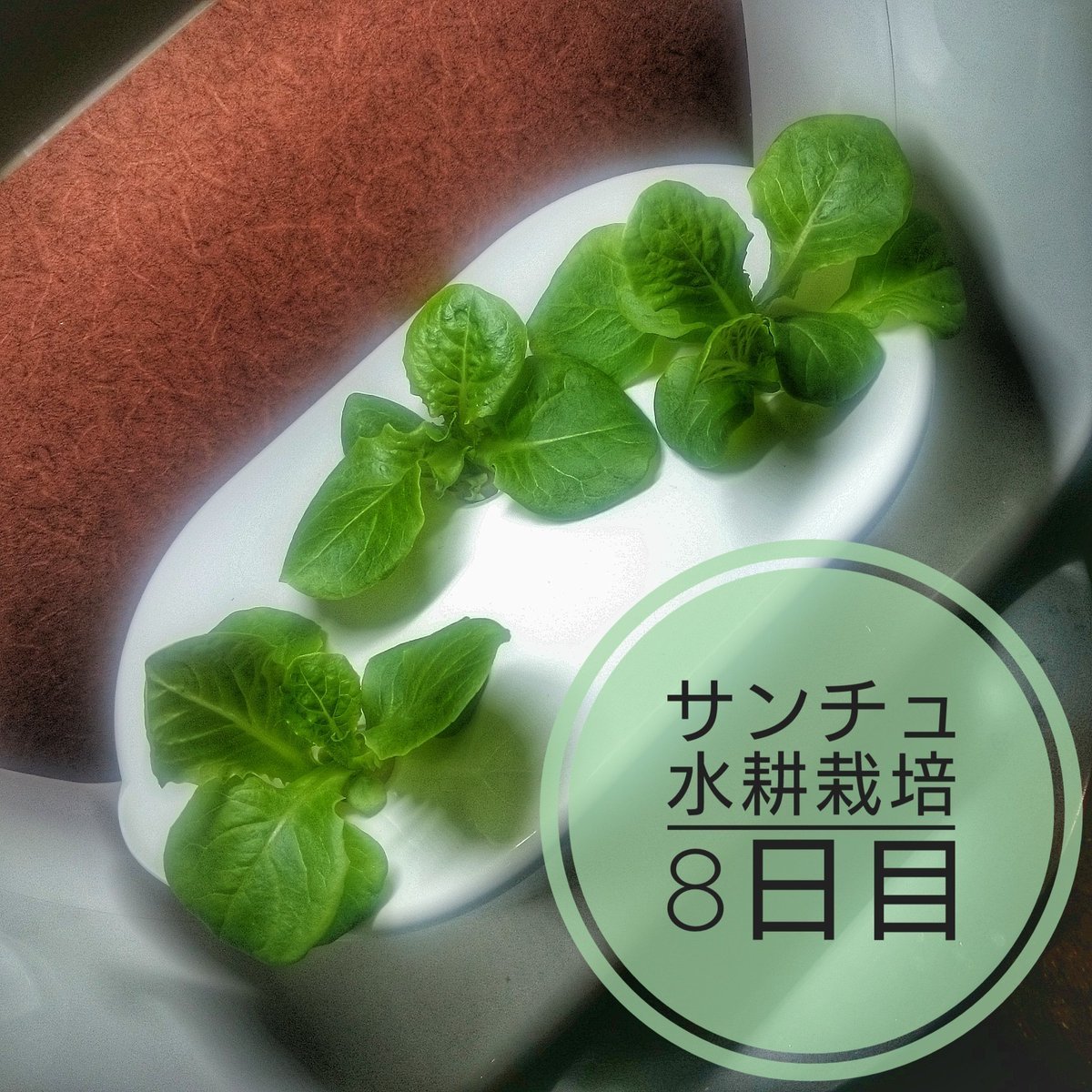一株に6~8枚の葉がつき、青々として来ました。このぐらい育つと、ちゃんとサンチュに見えますね😉
