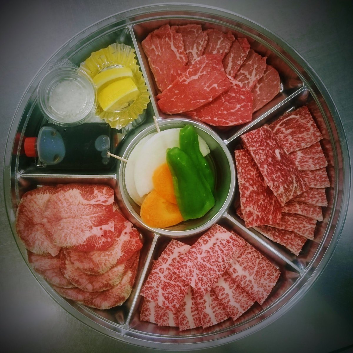 タン、カルビ二種、ロースに焼き野菜のセット、れんが亭自家製のタレとお塩もついてます。3〜4名様分でご予算 税別6000円になります。